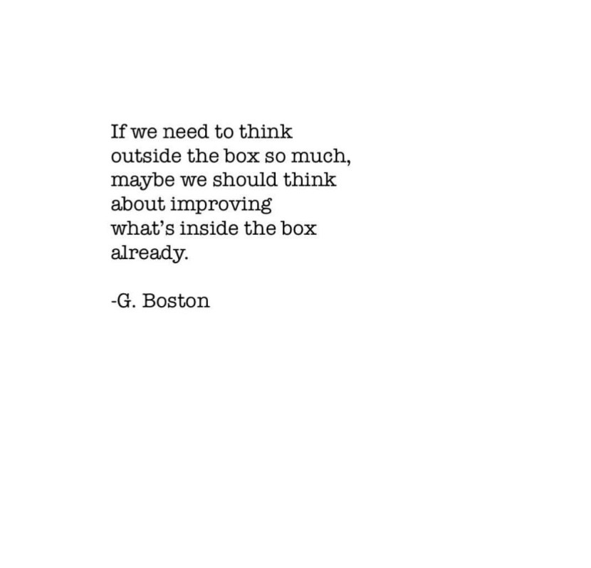 We’re always told to think outside the box. Often, that’s a very good thing to do. To get creative. To think differently. To take chances. To remove ourselves from the safety of our comfort zones. Hopefully by doing that (thinking outside the box), we can make thinking differently a normal process (inside the box). Think about it.