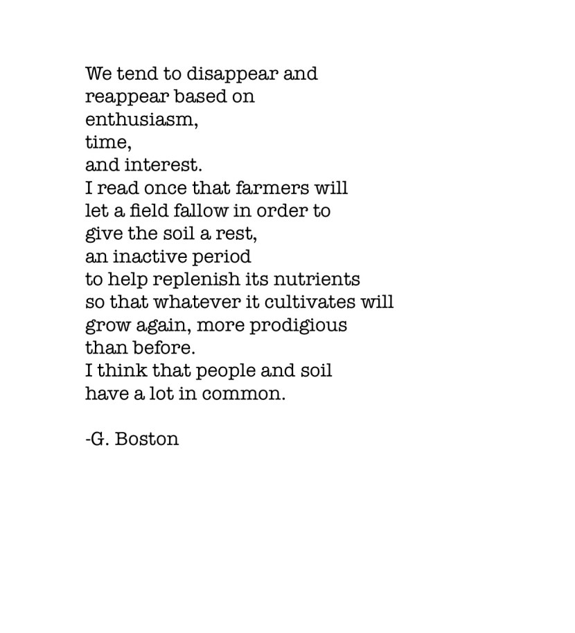 July 11, 2019 Poems – Fallow Sometimes you need to step back, take a break, and recharge in order to come back stronger than before. Share this: Click to share on Facebook (Opens in new window) Facebook Click to share on X (Opens in new window) X Click to email a link to a friend (Opens in new window) Email Click to print (Opens in new window) Print Click to share on Tumblr (Opens in new window) Tumblr Click to share on Pinterest (Opens in new window) Pinterest Like Loading...