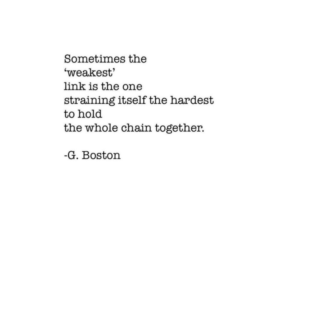 So often, what seems like a weak link is really perseverance; it takes a lot to hold it all together, to remain standing in the face of the strong winds that blow our way. I write a lot about positivity and moving forward, because I really believe in the power of that. If you’ve ever felt like a weak link, don’t let it defeat you. Stay strong. Hold that shit together. What can appear as weakness could be seen as strength. It’s all in the perception.