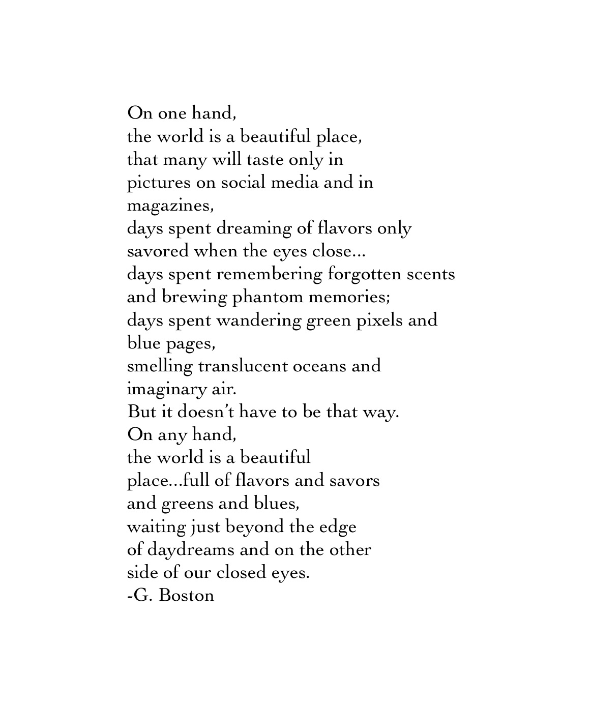The world will be the world; don’t let it get you down. Don’t let it crush your spirit. There’s a beauty in the world that continues to give life as long as we train our eyes to see that beauty.