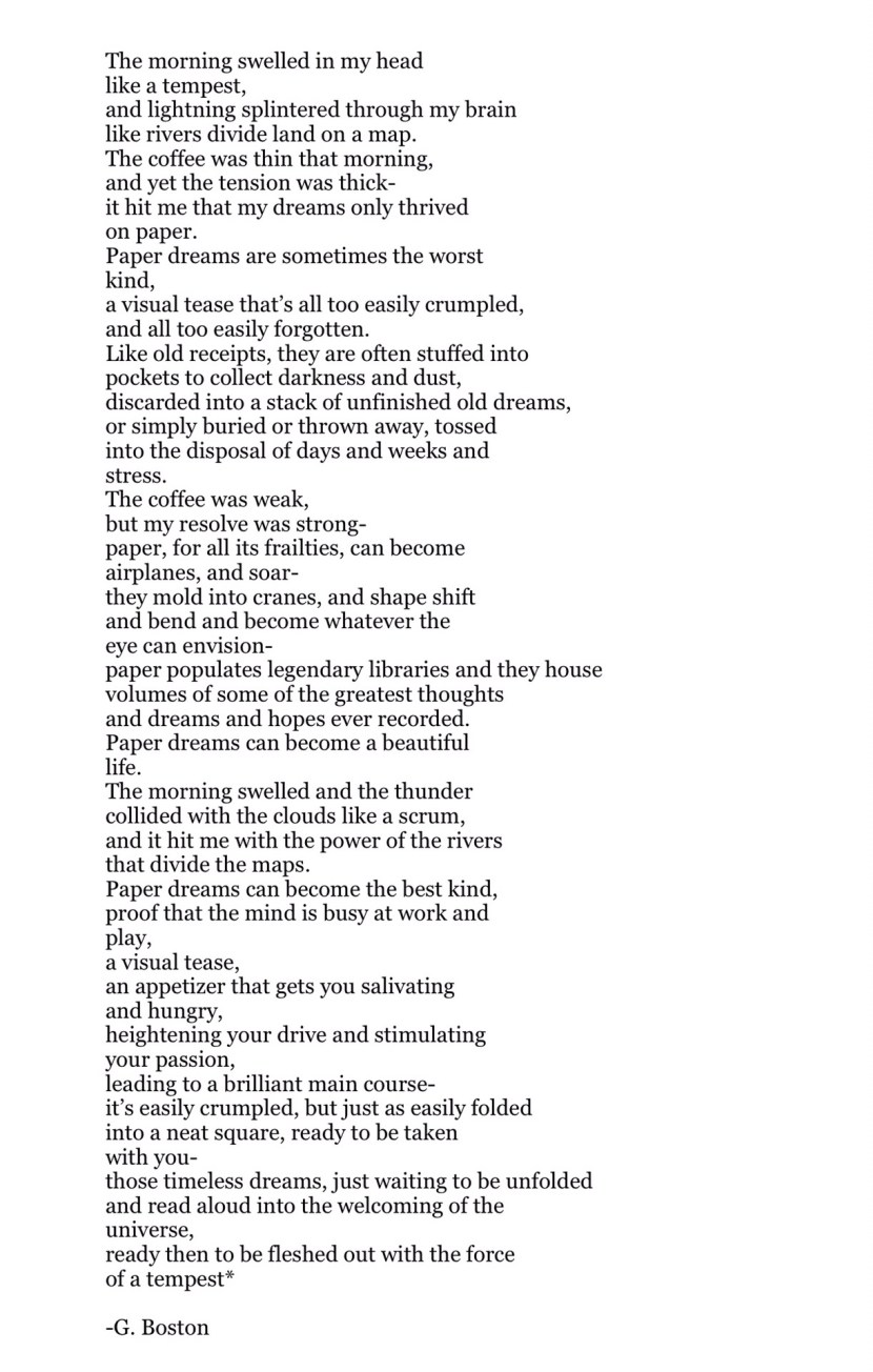 What happens to dreams when they’re cast aside like old laundry into an old darkened corner? Do they begin to smell? Do they rot? Do they grow hairy mold? Or do they just die…regretfully, painfully, scornfully, and utterly unforgiving of the person that relegated them to that less than golden fate? Do we blame ourselves? Do we blame ourselves as the result of our jobs? Or is it all one giant soup that we’re all stewing in, bubble by bubble, until we reach the boiling point that sends us oozing over the edge of the pot and into the unknown? Maybe there in that zone lies the reason behind it all…the purpose that we all so desperately seek…the one that very few of us have ever truly lived enough of in order to assist the rest of us schlocks that were too afraid to step out and live.