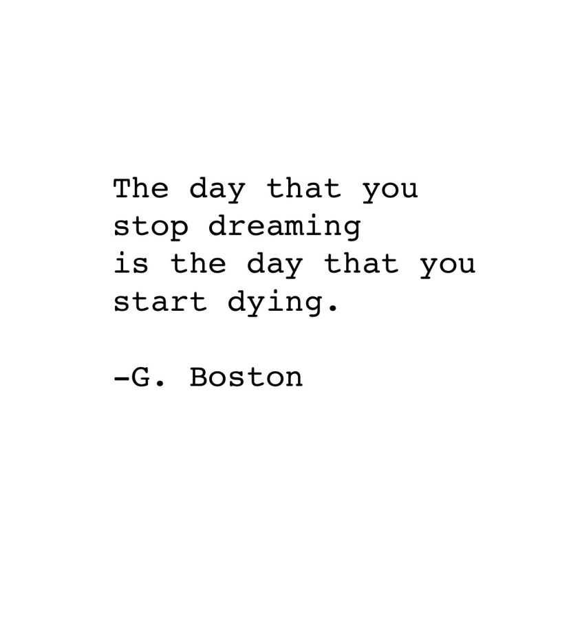 We all (by now) know just how much importance I place on dreams and goals. They’re the fuel that keeps the fire burning. They keep the wheels spinning. We all have a destination that we’re trucking toward…dream big and work hard…when you give up on those dreams, a piece of you dies. Sometimes those aspirations need a little CPR and TLC…so breath some life into them and keep on moving. Best of luck.