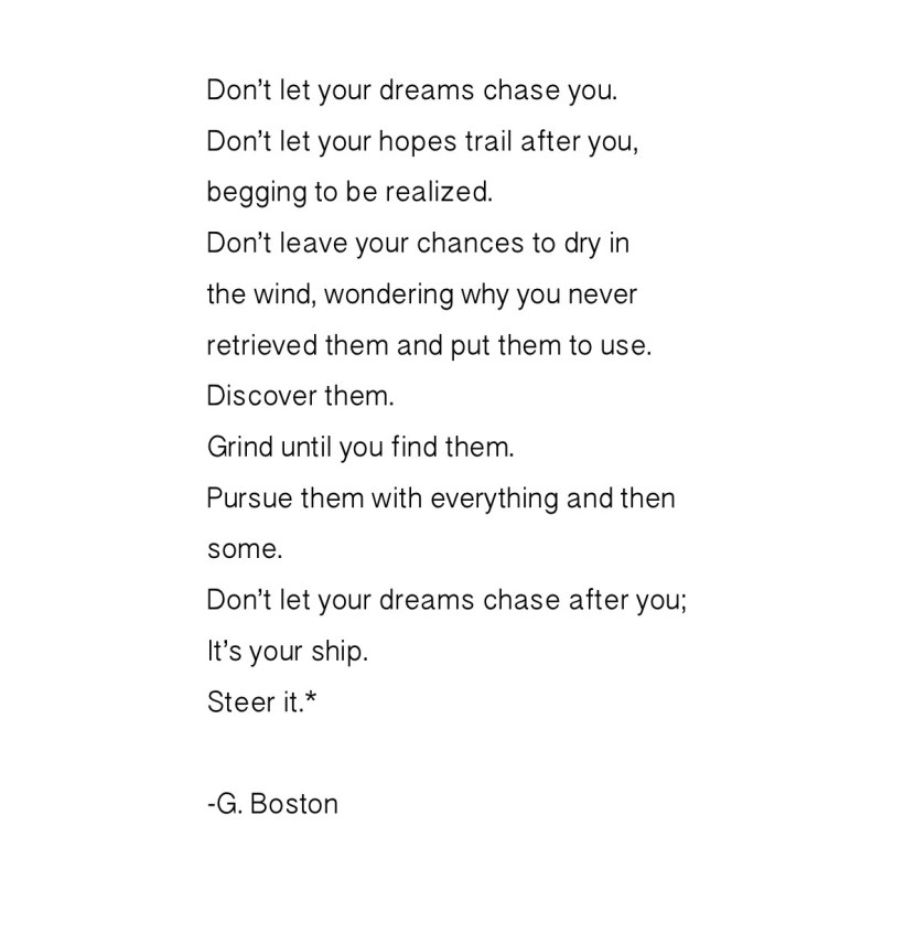 I really needed to be reminded of this message today (I mean I really needed to hear it); I hope that you can find some value in it as well. Take a moment to read and absorb the words (oh, it won’t take long)…if so, thank you for reading! Let’s put in the leg work and go after those dreams and goals. Today is the best day to start/continue. Be well, and Stay Creative.